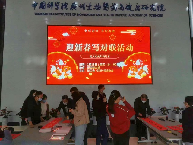 “創(chuàng)會(huì)”會(huì)員盧圣賢和江軍湖兩位同志揮毫潑墨、筆走龍蛇,書寫的對(duì)聯(lián)紅紅火火,“科技創(chuàng)新齊奮進(jìn),學(xué)術(shù)競秀譜新章”、“虎奔千里留雄勁,兔進(jìn)萬家報(bào)吉祥”等等,既飽含著對(duì)研究院科技創(chuàng)新勇立潮頭的深切期許,也為全體師生員工送上滿滿的福氣,現(xiàn)場洋溢著濃郁的節(jié)日氣息。寫就的春聯(lián)被現(xiàn)場師生員工一“搶”而空,為研究院增添了滿院“春”色。