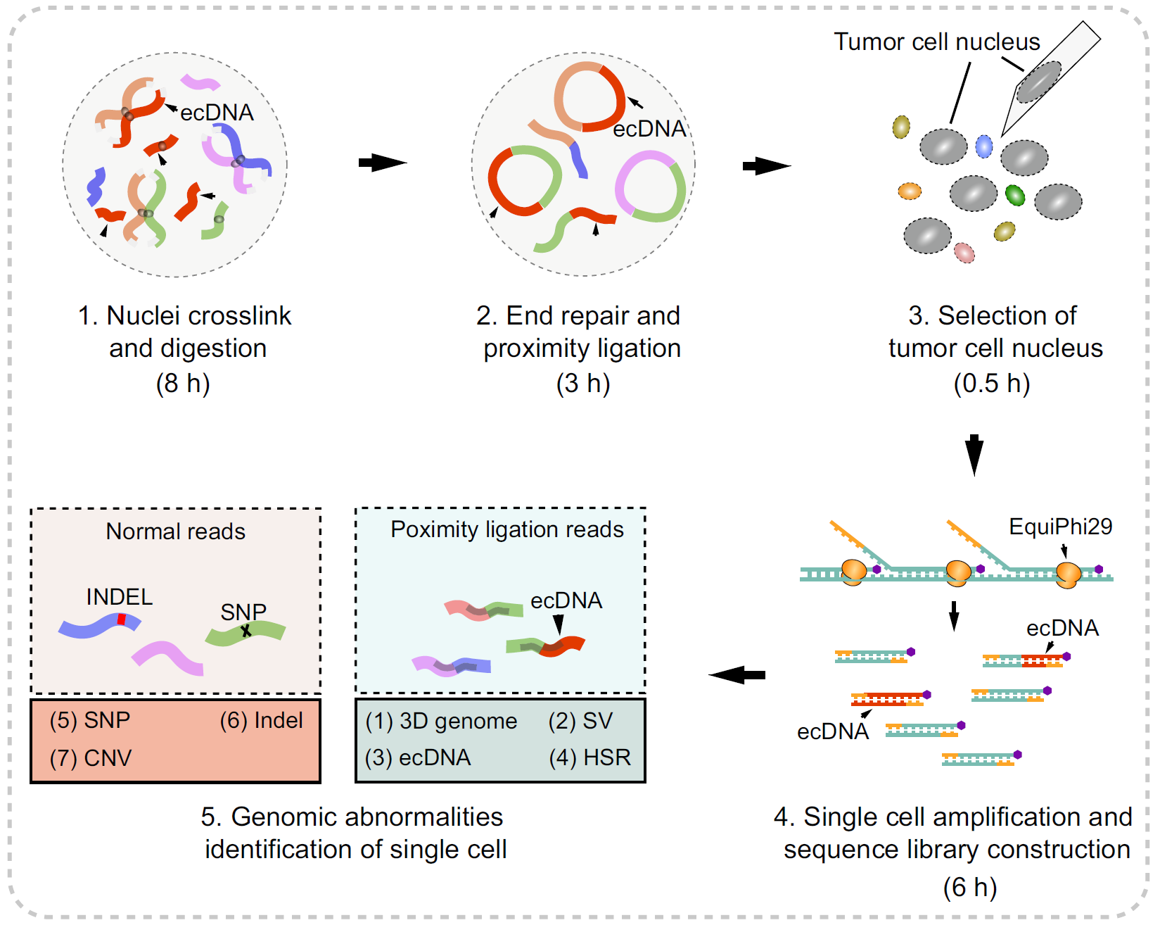 研究團隊利用Uni-C技術對胰腺癌來源的CTCs進行分析,僅整合7個細胞數據,即可還原約89%的SNP/INDEL與75%的結構變異,與腫瘤組織檢測結果高度一致,驗證了該方法在稀有細胞中的準確性與代表性。進一步分析發(fā)現,Uni-C可解析CTC中ecDNA的分子結構,以及處于細胞周期不同階段CTC所展現出的染色質構象差異,如A/B隔室重構與高階結構消失等,為評估CTC活性與細胞狀態(tài)提供了新維度。
