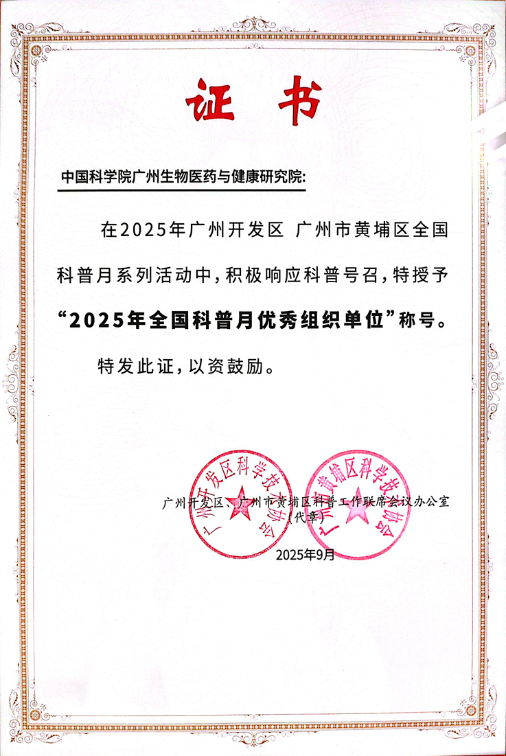近日,中國科學(xué)院廣州生物醫(yī)藥與健康研究院(以下簡稱 “廣州健康院”)憑借在全國首個(gè)科普月期間的出色組織能力、豐富活動形式及顯著社會成效,獲得黃埔區(qū)授予的“2025年全國科普月優(yōu)秀組織單位”稱號。