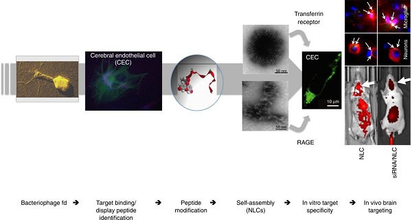 研究發(fā)現(xiàn)該層次結(jié)構(gòu)的納米配體載體通過轉(zhuǎn)鐵蛋白受體(transferrin receptor)和晚期糖基化終產(chǎn)物受體(the receptor for advanced glycation-end products)靶向腦內(nèi)皮細(xì)胞,并可以高效穿過小鼠血腦屏障到達(dá)神經(jīng)元和小膠質(zhì)細(xì)胞。更為重要的是納米配體載體可以裝載靶向β-分泌酶1(BACE1)的siRNA分子(BACE1酶是產(chǎn)生β-淀粉樣蛋白關(guān)鍵酶,而β-淀粉樣蛋白在大腦中的過度累積是阿爾茲海默癥典型的病理特征,所以BACE1酶是阿爾茲海默癥治療藥物的熱門靶點(diǎn))通過靜脈注射進(jìn)入小鼠大腦中,并有效地抑制BACE1的表達(dá)。整個(gè)系統(tǒng)沒有毒性和炎癥反應(yīng)。因此,該研究開發(fā)的納米配體載體作為一種安全的多功能納米載體,避免了噬菌體展示肽表面修飾納米顆粒主動(dòng)靶向有效性和特異性弱的缺點(diǎn),通過化學(xué)修飾賦予多肽配體自組裝形成可靶向的納米載體來實(shí)現(xiàn)主動(dòng)靶向性。為中樞神經(jīng)疾病藥物的腦靶向傳遞臨床轉(zhuǎn)化研究提供新的技術(shù)和理論基礎(chǔ)。