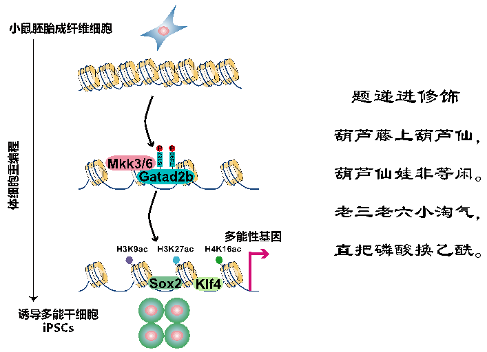 在經(jīng)典的激酶信號通路中,信號通過蛋白磷酸化傳遞;而在我們的最新研究中,發(fā)現(xiàn)信號可由蛋白磷酸化遞進(jìn)傳遞到蛋白的乙?;?。我們發(fā)現(xiàn)二級激酶家族7個(gè)蛋白中MAP2K3/6可通過磷酸化Gatad2b進(jìn)而調(diào)控組蛋白的乙?;_@表明了不同的蛋白翻譯后修飾存在著“遞進(jìn)修飾”的信號轉(zhuǎn)導(dǎo)新模式,并在多能干細(xì)胞命運(yùn)調(diào)控中發(fā)揮著重要功能。這正像“葫蘆娃”七兄弟中的老三、老六,具有把磷酸化信號變?yōu)橐阴;盘柕摹斑f進(jìn)修飾”特殊本領(lǐng)。