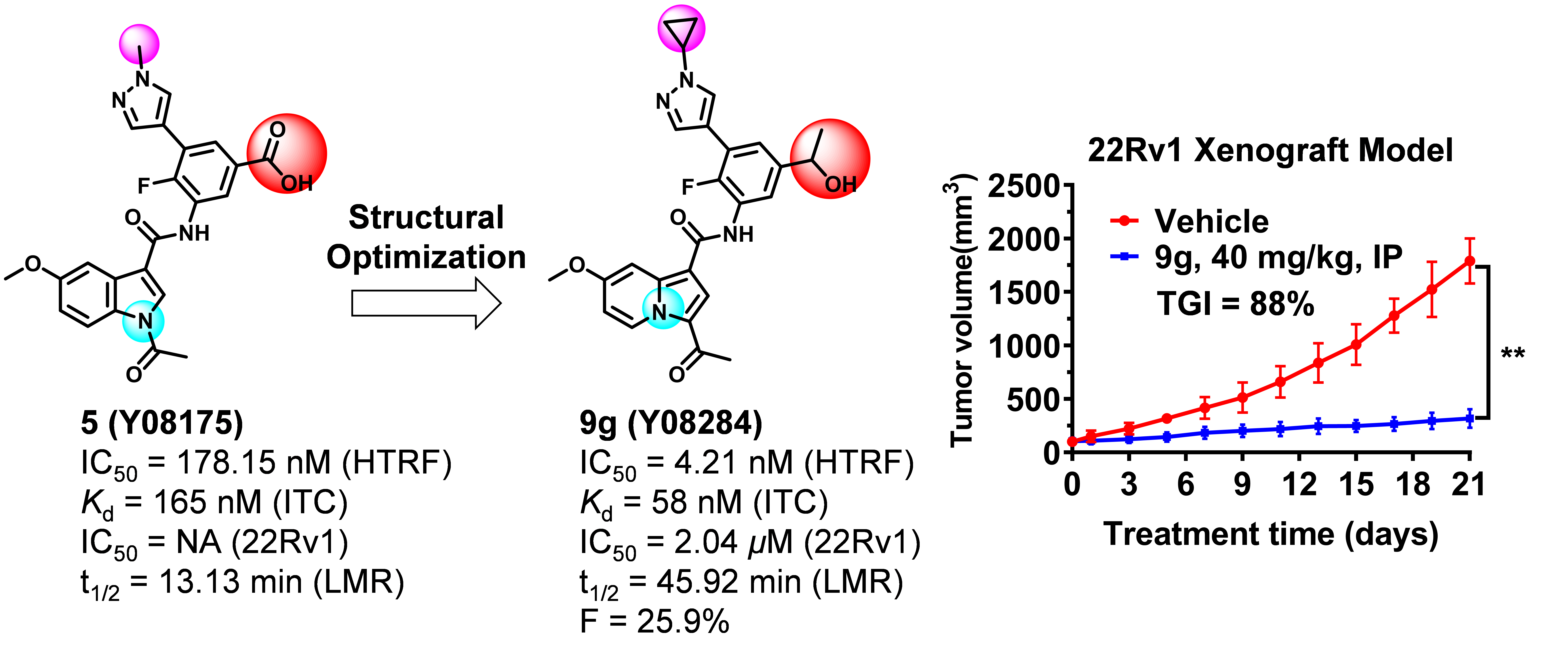 前列腺癌是一種雄激素依賴性的惡性腫瘤,極大地威脅著男性的健康?,F(xiàn)有的治療前列腺癌藥物均很快出現(xiàn)耐藥問題。因此,臨床上急需開展基于新靶點(diǎn)、新機(jī)制的抗前列腺癌藥物研究。為了解決上述問題,中國科學(xué)院廣州生物醫(yī)藥與健康研究院許永課題組針對前列腺癌治療新靶標(biāo)CBP設(shè)計合成了新型小分子抑制劑,代表性分子Y08284經(jīng)過動物實(shí)驗證明有望治療耐藥性前列腺癌。該成果于近日以Design, Synthesis, and Biological Evaluation of 1?(Indolizin-3-yl)ethan-1-ones as CBP Bromodomain Inhibitors for the Treatment of Prostate Cancer為題發(fā)表在Journal of Medicinal Chemistry的Epigenetics???。