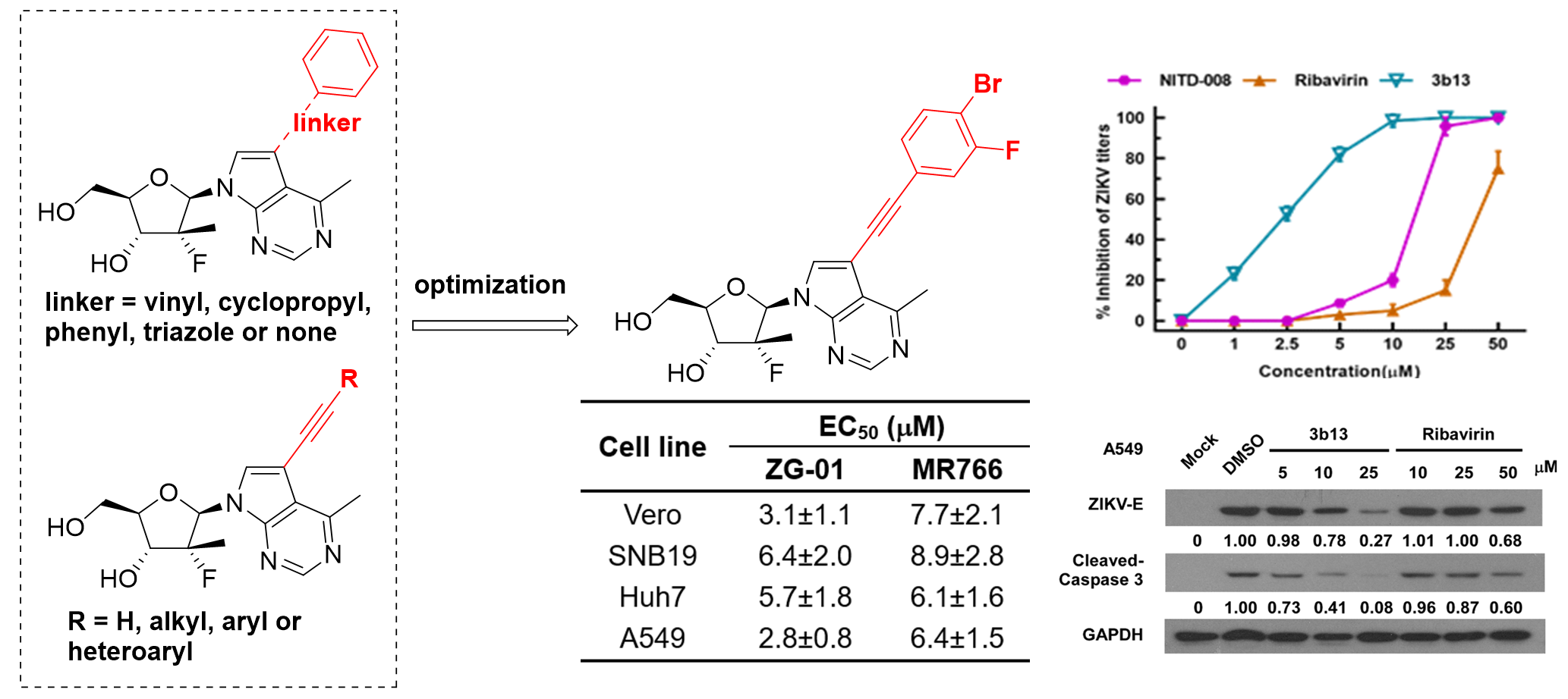 RNA依賴的RNA聚合酶(RdRp)一直是抗病毒藥物的熱門靶點,核苷類似物可通過靶向病毒RdRp,摻入新生的RNA鏈而導致病毒RNA復制終止。近年來核苷類藥物在抗病毒領(lǐng)域發(fā)揮著重要作用。張健存課題組一直致力于核苷類抗病毒藥物的研究,并取得了系列重要進展,先后發(fā)現(xiàn)了一系列對流感病毒和登革熱病毒具有抑制活性的新型核苷類似物(Antivir. Res. 2016, 129, 13-20;Antivir. Res. 2018, 149, 95-105)。