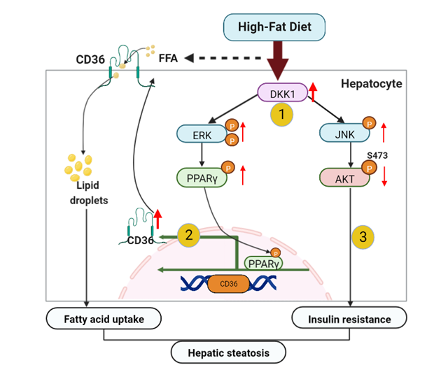 近日,中國(guó)科學(xué)院廣州生物醫(yī)藥與健康研究院李尹雄研究員課題組在Life Science Alliance上發(fā)表了題為Hepatic DKK1 driven steatosis is CD36-dependent的研究論文。這項(xiàng)研究闡明了高脂飲食誘導(dǎo)肝內(nèi)DKK1升高進(jìn)而促進(jìn)肝脂肪變性的病理基礎(chǔ)。 DKK1通過(guò)ERK-PPARγ軸上調(diào)CD36增加脂肪酸攝取,通過(guò)上調(diào)JNK信號(hào)加劇肝胰島素拮抗,兩者的疊加是DKK1驅(qū)動(dòng)脂肪肝的關(guān)鍵事件。