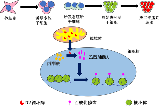 三羧酸循環(huán)(tricarboxylic acid cycle, TCA cycle)作為需氧生物體內(nèi)最普遍存在的代謝途徑,是物質(zhì)代謝與能量代謝的重要樞紐。線粒體TCA循環(huán)酶正常行駛功能是TCA循環(huán)維持的關(guān)鍵。TCA循環(huán)酶在一些惡性腫瘤細(xì)胞中能從線粒體轉(zhuǎn)運(yùn)到細(xì)胞核內(nèi)發(fā)揮DNA修復(fù)和表觀遺傳調(diào)控的作用。然而,TCA循環(huán)酶在多能性獲得與轉(zhuǎn)變中時空調(diào)控的規(guī)律和作用還完全不清楚。