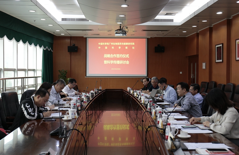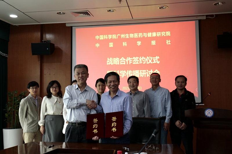 4月9日,中國科學(xué)院廣州生物醫(yī)藥與健康研究院(簡稱廣州健康院)與中國科學(xué)報(bào)社戰(zhàn)略合作協(xié)議簽約儀式暨科學(xué)傳播研討會(huì)在廣州健康院第一會(huì)議室舉行。廣州健康院院長陳新文、中國科學(xué)報(bào)社黨委書記劉峰松代表雙方簽訂協(xié)議。會(huì)議由廣州健康院黨委副書記、紀(jì)委書記侯紅明主持。
