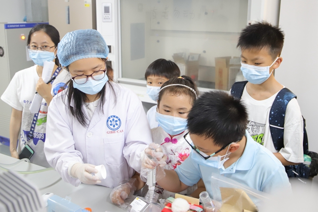 科普報告后,科普志愿者帶領(lǐng)公眾們干細胞實驗室、化學實驗室、感染與免疫實驗室、動物中心、超算中心以及公用儀器中心。參觀過程中,志愿者們和實驗室的工作人員向公眾展示了部分科研設(shè)備和基本操作,同時細致講解了生命科學相關(guān)研究手段及科普展覽內(nèi)容,通過參觀講解進一步拉近了社會公眾與科學研究的距離。此外,互動小實驗中,學生紛紛穿上實驗服,并戴上手套,體驗一把科學家的癮。