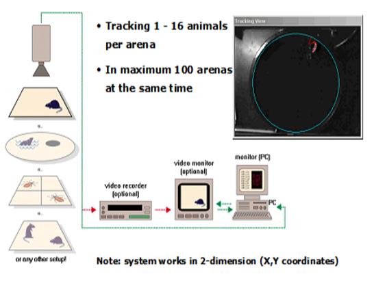 購(gòu)自荷蘭Noldus公司的小動(dòng)物行為活動(dòng)軌跡記錄分析系統(tǒng)可用于曠場(chǎng)實(shí)驗(yàn),避暗實(shí)驗(yàn),Morris水迷宮實(shí)驗(yàn),T字宮,Y字宮,八臂迷宮(放射宮),高架十字宮,懸尾實(shí)驗(yàn)和強(qiáng)迫游泳實(shí)驗(yàn)。此系統(tǒng)可以記錄小動(dòng)物行為活動(dòng)軌跡,起始時(shí)刻,運(yùn)動(dòng)時(shí)間,運(yùn)動(dòng)速度,停留時(shí)間,各個(gè)區(qū)域內(nèi)的運(yùn)動(dòng)距離,進(jìn)出區(qū)域次數(shù),第一次進(jìn)入某個(gè)區(qū)域之間的時(shí)間,停留時(shí)間,多只動(dòng)物相互交往活動(dòng)和原始活動(dòng)錄像,同時(shí)得到實(shí)時(shí)變化的運(yùn)動(dòng)軌跡和動(dòng)物活動(dòng)形態(tài)(飲食,睡眠,移動(dòng),追逐等)資料。