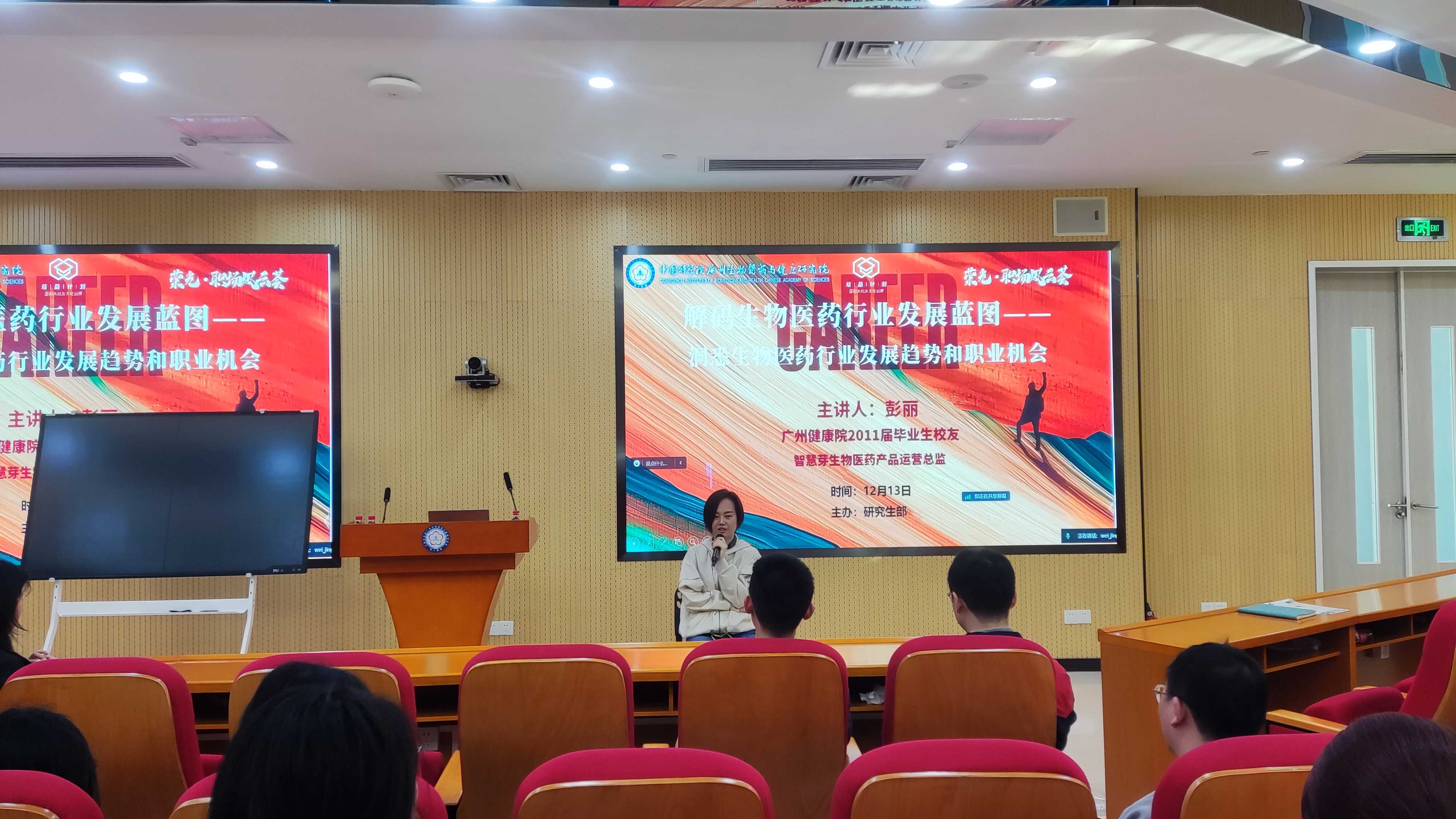 為助力研究生職業(yè)規(guī)劃,幫助研究生了解生物醫(yī)藥行業(yè)未來職業(yè)趨勢和職業(yè)機(jī)會(huì),12月13日,廣州健康院舉辦“解碼生物醫(yī)藥行業(yè)發(fā)展藍(lán)圖——洞悉生物醫(yī)藥行業(yè)發(fā)展趨勢和職業(yè)機(jī)會(huì)”專題交流會(huì),邀請2011屆畢業(yè)生校友彭麗來院與在學(xué)研究生座談交流。